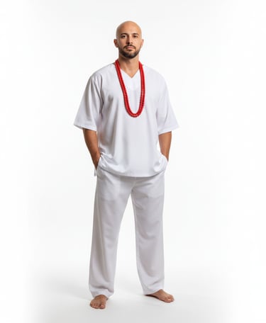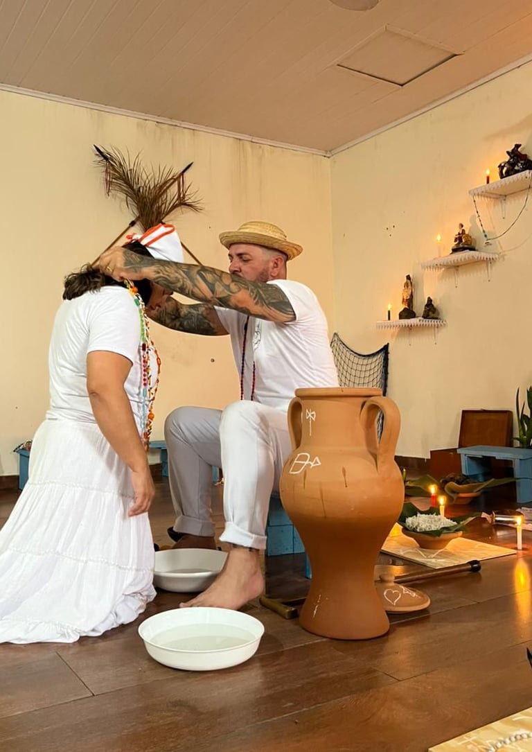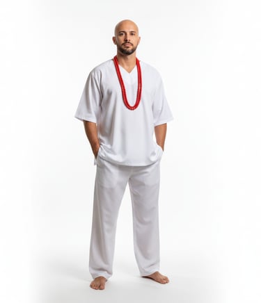 Na esquerda são roupas pretas ou vermelhas como calça, camiseta ou roupas das entidades que ficam sobre critério das mesmas, passando pelo crivo Pai de Santo